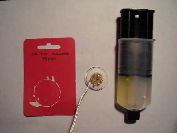 Hay tres partes para un poseedor de moneda de Air-Tite, la tapa, la base y el anillo de junta. El anillo de empaque se ajusta alrededor de una moneda y encaja dentro de la base. La tapa entonces se desliza sobre la parte superior. Este proyecto utiliza solamente la base y el anillo de junta.