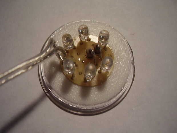 Antes el pegamento comienza a configurar, coloque la placa de circuito en el anillo de espuma y posición dentro de la base encima de la cola. Presione hacia abajo alrededor de los bordes del anillo de espuma. El borde del anillo de espuma pegaremos encima de la base de un milímetro o menos y que es normal. Exceso de pegamento se exuda hacia arriba a través de los agujeros no utilizados en el circuito.