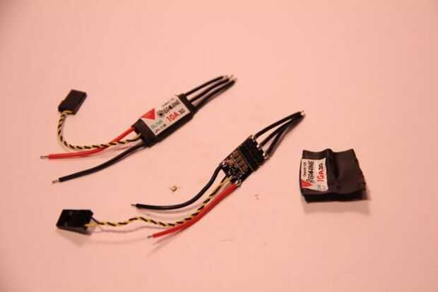 A continuación debemos preparar las armas y la electrónica para ir con ellos. Los termoencogibles pueden eliminarse de cada ESC como los tres alambres negros. Podemos cortar los cables del motor a longitud y despojarlos (sea extremadamente cuidadoso aquí como los cables son delgados y delicados). Si los cables por debajo son de plata (estañado) adelante y soldarlos a la ESC. Si no, son muy probablemente oro (no en lata) y es muy probable que todavía tenga una capa de esmalte de ellos. Que desea eliminar esta capa de esmalte delgada raspando el alambre con un cuchillo antes de cada alambre de estañado y soldadura a la ESC.