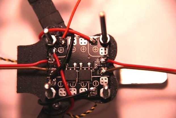 En la segunda foto se puede ver cómo he ejecutar los cables negro y rojo de cada ESC a su lado respectivo de la PDB. Todas las teclas «+» están conectados como son de la "-" pastillas cuando eventualmente conectar energía para las pastillas de todas las pastillas recibirá energía de una batería. No alambre de la ESC al revés ya que no tiene protección contra polaridad inversa y se quemarán si se conecta les hacia atrás.
