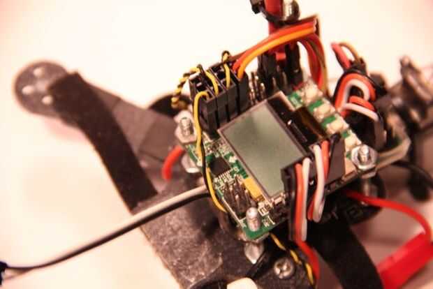 Carril de la izquierda (cerca de la parte inferior): Los cables de servo de 10cm del receptor se enganchan para arriba a sus entradas respectivas de la KK. Ignorar la matriz 2 x 3 de patillas, que se utiliza para flashear la KK más tarde si quieres.
