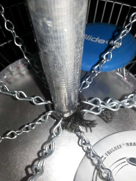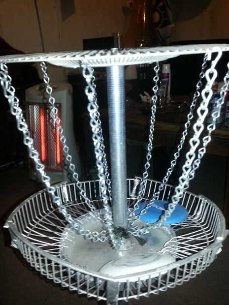 la cesta está hecha de un ventilador de 10 pulgadas. Tomé el ventilador aparte y había pedazos. Corté uno de los lados para que era plana por la parte superior. Enrosca esta pieza en un trozo de 1 ft de tubería de pvc. pongo un corcho en el pvc para atornillar. Corté el lengh cadena pedazos de 1 ft. Para el fondo de la canasta que usé el otro tiene del ventilador con el los lados que se curvan hacia arriba y cortaron para caber en las tapas.
