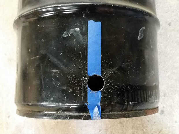 El siguiente es el aire del maquillaje. Esta compuesto por 3/4npt niples (3) montado en la parte inferior del tambor. Marque los orificios de 2-1/2" de la parte inferior del tambor. Usé la misma medida de los agujeros de la rejilla para el posicionamiento. Para montar el npt de 3/4 cierre pezón necesita perforar un orificio que es aproximadamente 7/8" de diámetro. Un taladro de paso grande, serrucho o golpe de gracia hará el truco.