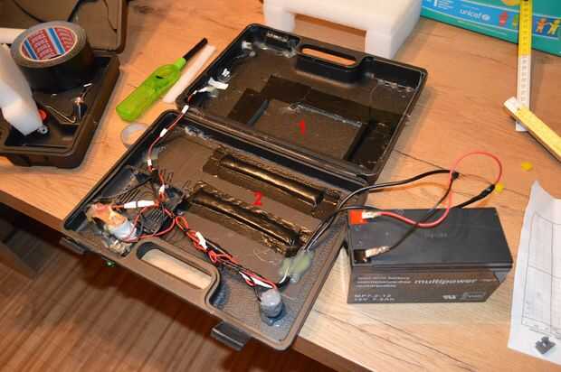 2. algunos materiales de embalaje cubrí en cinta negra para llenar el espacio entre la batería y la caja. Ahora se ajusta perfectamente.