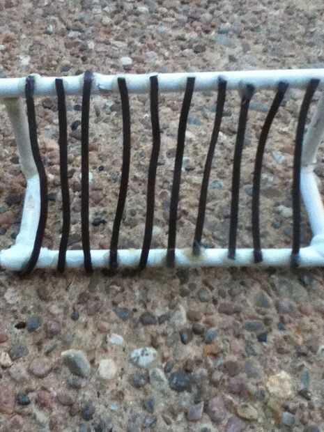 Cuando eso esté hecho, cortar las gomas por la mitad y pegamento caliente a ellos a través de los postes de 6". Finalmente tomar un pequeño trozo de papel y se desmenuzan para actuar como la bola.