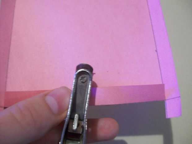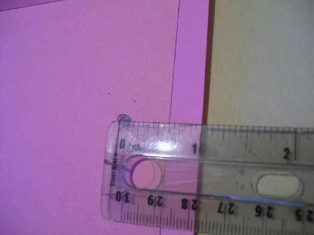 Todas las piezas en la tarjeta han sido terminadas. ¡ Hurra! Pero aún no está terminado. Ahora, para hacer la tarjeta real. Tomar el medio pedazo de papel, (uno más grande) y medir un centímetro alrededor de tres de los bordes como se muestra en el cuadro 3. Cuadro 4 muestra dónde cortar y luego doble, como en la foto cinco. Dibuja un pequeño punto de una pulgada arriba del lado corto como la imagen de seis y perforar un agujero de media pulgada de ancho sobre él.
