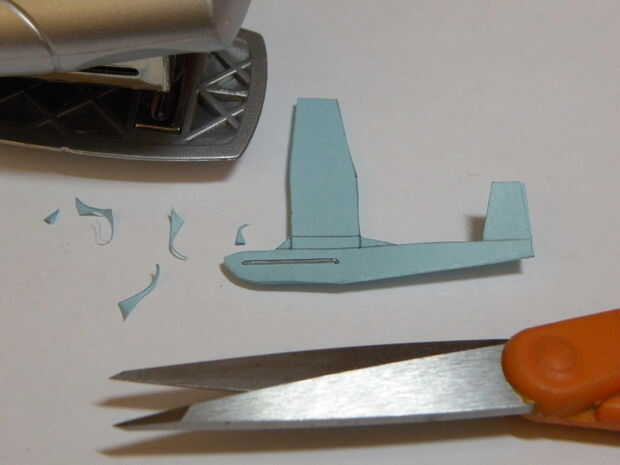Agregue cuidadosamente el alimento básico para el diseño como se indica, juntar las capas para que no Haz alabeados. La grapa funciona como un lastre de nariz a cambio centro de gravedad de la aeronave hacia adelante. Asegúrese de que está centrada en el espacio provisto. Si no, quitar e insertar otro elemento básico en la posición correcta. Se recomienda probar la grapadora sobre el papel de desecho para determinar la ubicación exacta de las grapas. Después de aplica la grapa, recortar la forma de la nariz.