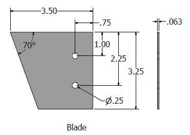 Corte la hoja como se muestra de una hoja gruesa de 1/16" de acero. Una vez más, tomar una decisión en los orificios de 1/4". Tenga en cuenta que es más fácil de afilar la cuchilla en este punto. Usé una afiladora de borde para afilar la hoja.