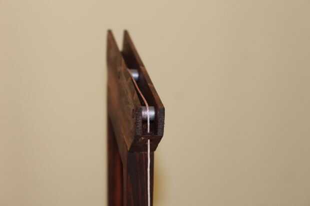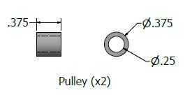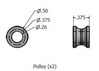 Estoy mostrando dos opciones de polea. La primera versión utiliza una clavija de 1/4" y un espaciador de un antiguo conjunto de k'nex. Realmente no cuido de esta opción ya que la cadena se captura entre el espaciador y el pasador. Una segunda solución, modeló una polea y 3D se había impreso en mi biblioteca local. El costo total para dos poleas fue de $0.50. He incluido los archivos STL y STP aquí en caso de que desee imprimir su propio.