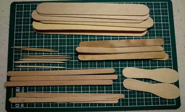 tuve el placer de adquirir recientemente una caja de depresores de lengüeta de madera de un proveedor médico local.  El ancho un poco más grande del depresor de lengua en comparación con el palito más amplia que tengo hasta ahora fue una ventaja en la modelización de las alas de Gunstar enorme (y cortas).  Mi fuente habitual de agitadores del café de madera fino y grueso, un par de cucharas de Copa de helado de madera y varios tamaños de palillos constituyen las piezas más pequeñas de la fabricación de Gunstar.