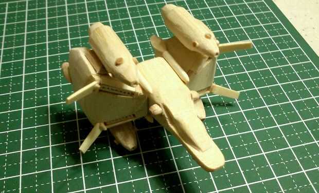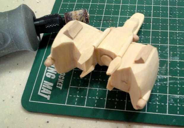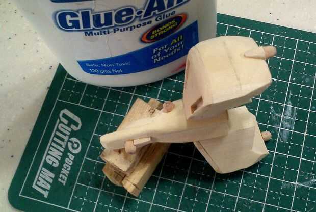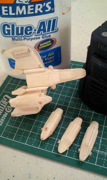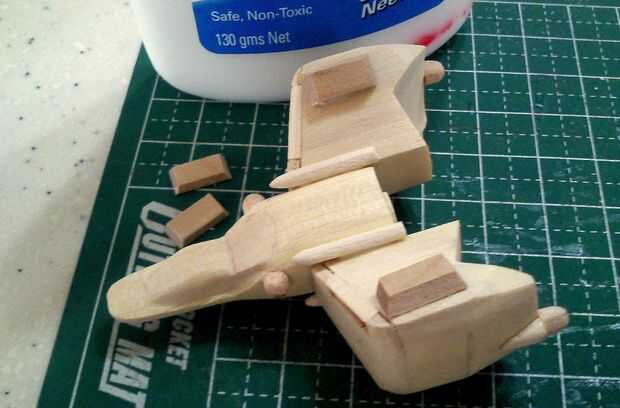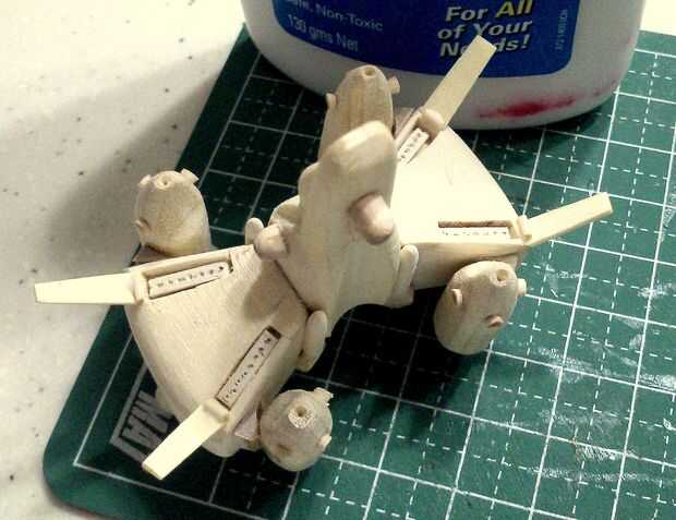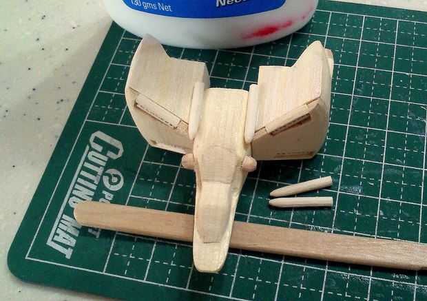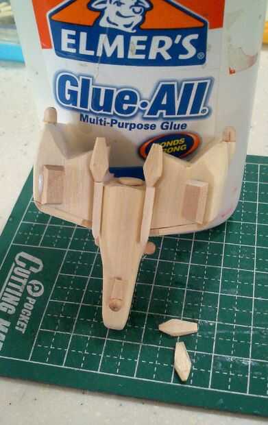 Los montajes de motor de cuatro 4 eran de un agitador de café madera espesor, biselado en los cuatro extremos utilizando un accesorio de la lijadora de disco fino. Cada uno de los montajes de motor fueron pegados en los extremos superior e inferior de las alas cerca de los bordes. Después de ajustar los soportes de motor, un 1/4" tambor lijadora accesorio con un grano fino fue utilizado para formar una curva en los bordes interiores para acomodar la forma cilíndrica de los motores de Gunstar.