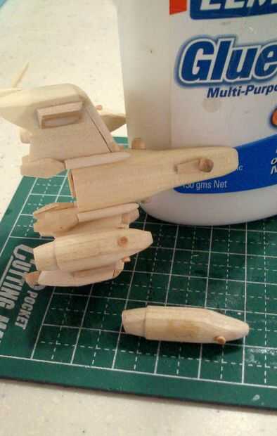 Las alas estaban pegadas, uno a uno, a cada lado del fuselaje. Palitos de repuesto apilados fueron utilizados para apuntalar el fuselaje mientras el pegamento que enlaza las alas con el fuselaje seca.