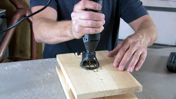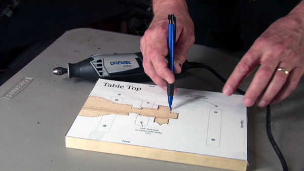 Seleccione uno de los paneles de 10"(cortados de 1 x 8 x 4) para ser la tapa de la mesa y coloque la plantilla sobre él. Fijarlo con un poco de cinta scotch o simplemente sujetarlo mientras se trazado el contorno de la Dremel y la minisierra (1). Use un punzón, clavo o tornillo para marcar los orificios. Poner una muesca en la madera para ayudar a estable la broca cuando usted comienza a taladrar los agujeros.