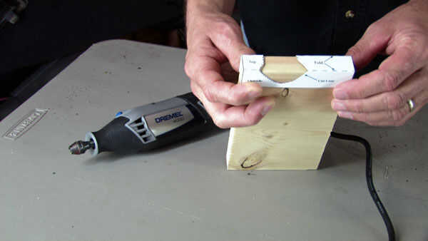 Corte alrededor de la frontera y a lo largo de la línea de corte. Doble a lo largo de las líneas y coloque la plantilla de doblado directamente sobre la parte superior del panel lateral izquierdo (3). Asegúrese de que la parte de la plantilla con la etiqueta "fuera" está en el lado que desea ver (un lado de la madera generalmente se ve más bonito que la otra). Trazar el contorno y utilizar la Dremel para moldear la madera hasta los partidos contornos "cerca" de la línea. NO lije esta demasiado en este momento! Por ahora apenas consigue cerca del contorno y después usted puede hacer para un ajuste perfecto.