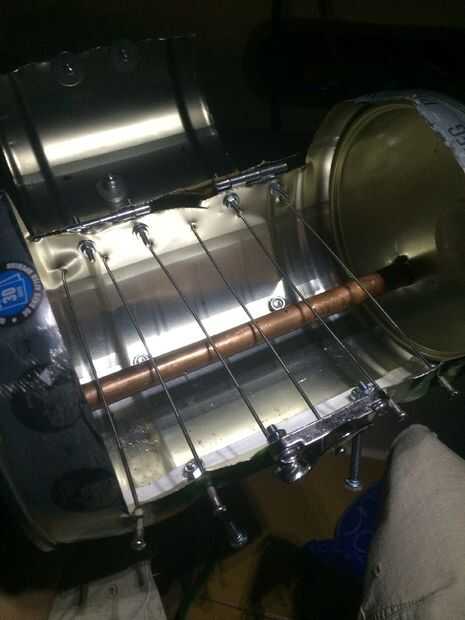 6 agujeros perforaron broca 9/64 comentar equidistante aparte van longitud de la apertura, varilla de bicicleta de corredera a través y empeñados en volver a celebrar. Hay que recortar más adelante, por ahora sólo los doblados hacia arriba y envueltos con una (ver foto)