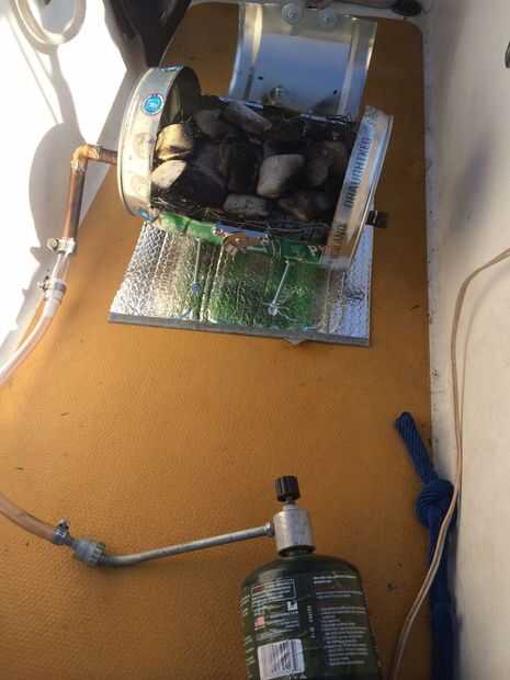 1. Ponga a funcionar el calentador sobre aislamiento de algún tipo. No creo que la fibra de vidrio para soportar el calor generado por el fuego, por lo tanto, como en el pasado, ponemos un echado a un lado cortina de la ventana de aluminio por debajo al bloque calor de la fibra de vidrio. Afortunadamente ahora, la pieza es mucho menor que antes por la chimenea monobloque.