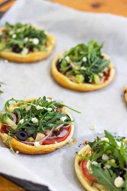 4. Unte salsa para pizza (echa un vistazo a mi salsa de pizza) encima y con verduras, queso (cortado o desmenuzado) y las aceitunas.