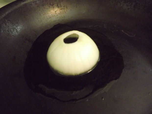 3. Coloque la cebolla en la sartén con el círculo grande tocando la cacerola.