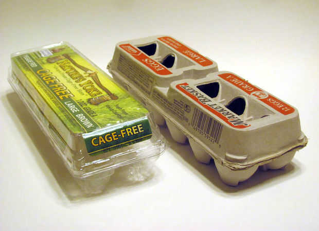 1. un cartón de huevos en clearplastic. Generalmente se venden huevos 'exclusivos' (gama libre, orgánico, etc.) en estas.