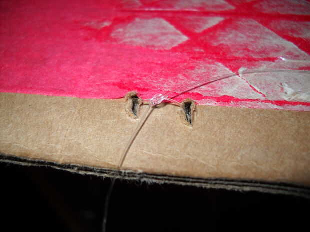 Empuje los dos cabos sueltos de una de las líneas a través de un conjunto de agujeros en un lado del cartón.  Deje los otros agujeros solo por ahora.