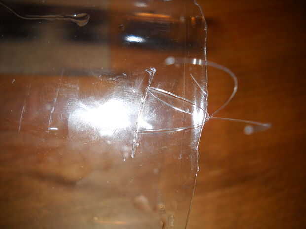 Corte 2 piezas de la línea de pesca cerca de 6 pulgadas de largo.  Doblar por la mitad y empuje el extremo de una línea a través de cada una de las ranuras del interior de la botella.  Tire de los extremos sueltos de la línea a través del lazo y tire con fuerza, creando un nudo.