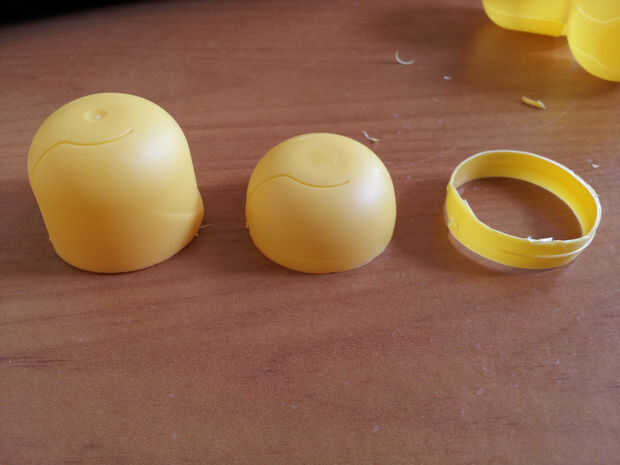 Es necesario separar las dos mitades del huevo Kinder. Están conectados con una rótula plástica pequeña. Este corte con cuchillo. Luego retire el anillo de plasic delgada que traba las dos mitades juntas. Esto es difícil de hacer así que Tome sutiempo con nada para apoyar el plástico que podría cortar su auto bastante mala.