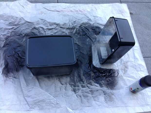 Sólo vinieron en un color translúcido y por lo tanto, sabiendo que las raíces no les gusta la luz, y dejando una tina de solución nutritiva en luz directa sol puede ser una muy mala idea para control de algas, adelanté que un aerosol pintado ambos recipientes un negro plano agradable en el exterior.