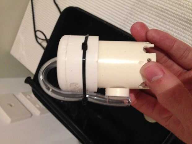 He utilizado un trozo de tubo de PVC dos veces el ancho de la tubería de rebose. Coloque un casquillo de extremo, haga un orificio en la tapa del extremo y fije un snorkel. Asegure con abrazaderas.