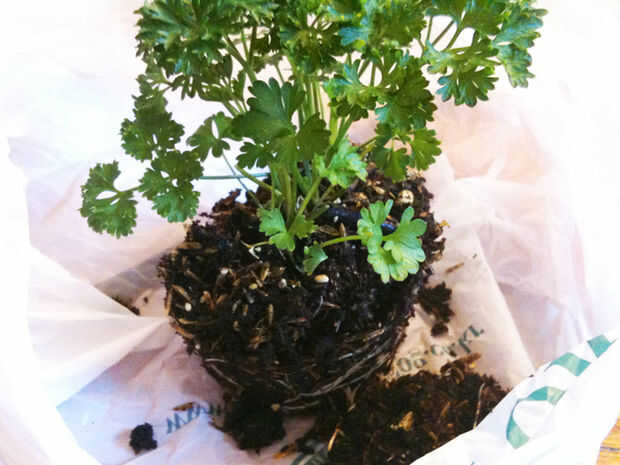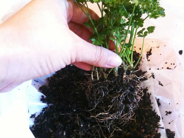 Tomar hierbas fuera del contenedor existente y quitar el suelo de las hierbas suavemente ya que podría dañar la raíz de hierbas.