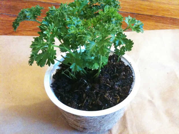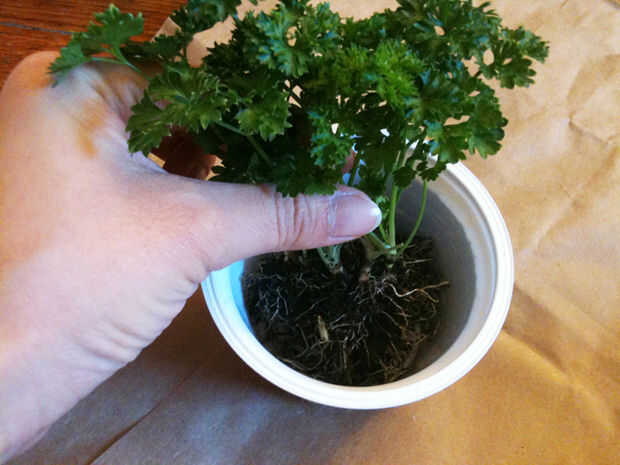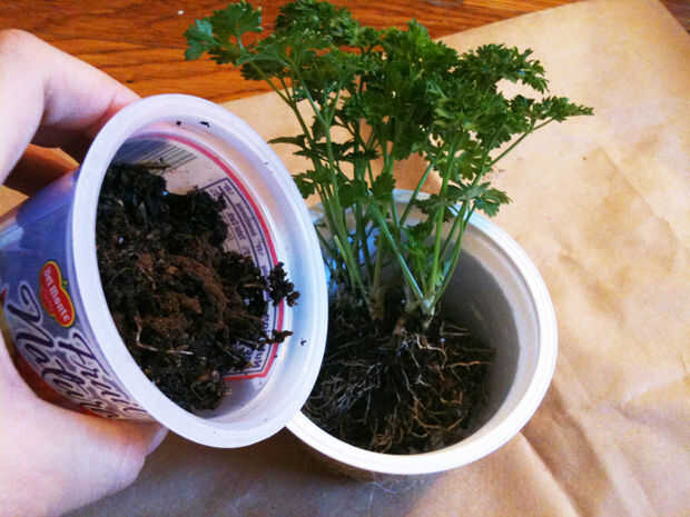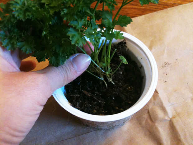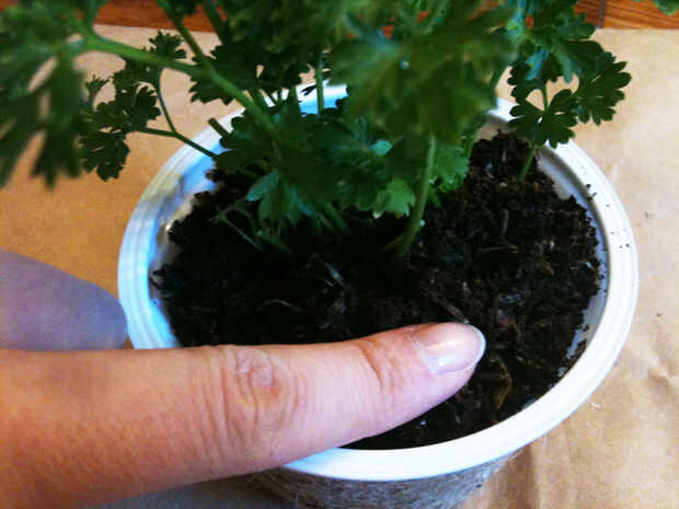 Plantar hierbas en el centro del recipiente y cubrir con tierra mezclada (paso 4). A continuación, presione suavemente el suelo para liberar cualquier bolsa de aire.