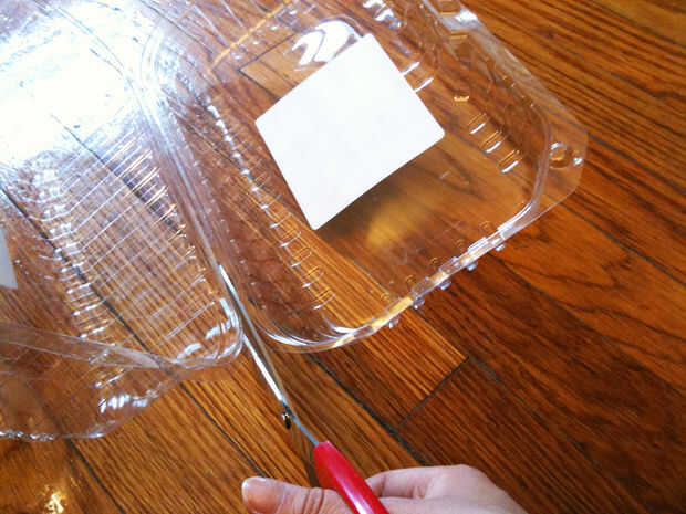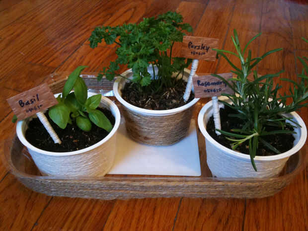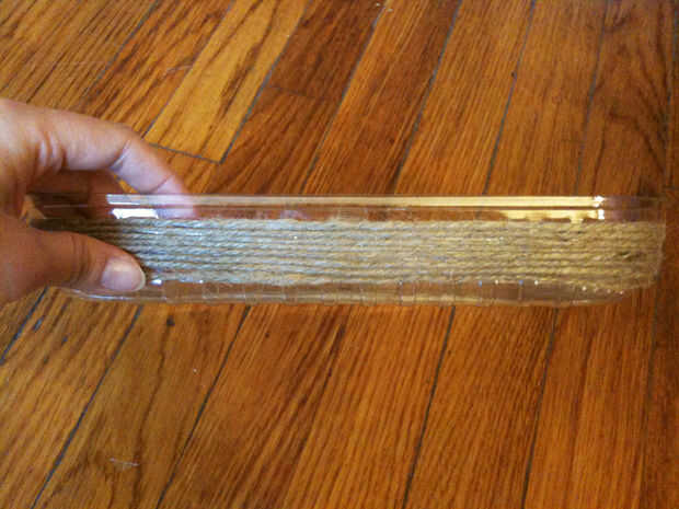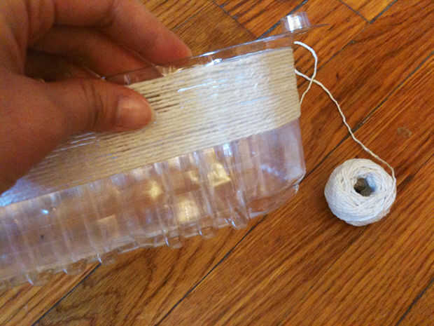 Tomar el contenedor más grande para hacer una placa. Es ensaladera plástico usado, así que tenemos que cortar la tapa y hacer dos placas. A continuación, hacer lo mismo (paso 3). Coloque la cinta de doble cara en el cada lado del recipiente y envuelva la cadena o el hilo en ella. Colocar las hierbas en el plato.