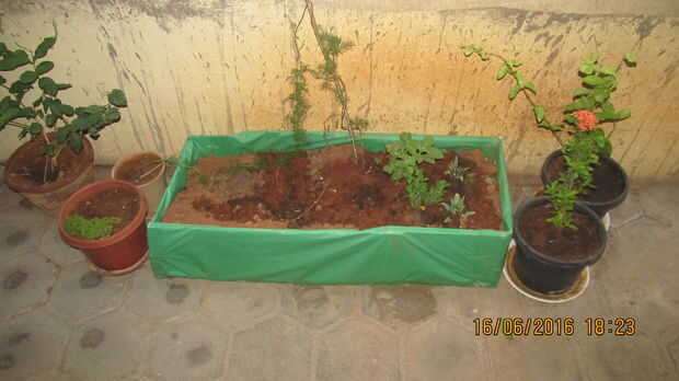 Me llenó de arena y mantiene dos plantas de piña. He crecido piña ya en mi viejo jardín por lo que estoy tratando aquí una vez más. Mantenido un retoño un escalador y ayer sembró algunas semillas de Thulasi(Holy Basil) y frío. ¡ Mirando adelante para construir un jardín terraza pronto. Dedique tiempo para plantar para que obtendrá verde ambiente, alrededores frescos debido a la evaporación. Cuando la planta crece y produce, su corazón florece demasiado y estoy seguro de que podrá disfrutar y amar desde su otra forma viviente :) Sienta por favor libre de preguntarme cualquier duda.