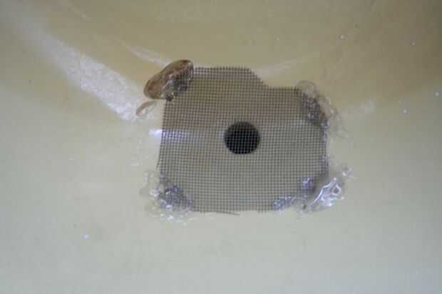 Lo primero es pegar la pantalla en el orificio de desagüe en el tazón de fuente por lo que actúa como un filtro y barrera para que el sustrato no caería el tanque y para evitar la obstrucción del orificio que podría conducir a inundaciones de todo el tazón de fuente, no la mención el tocador sí mismo. Preferí utilizar soplete de gas la pistola de pegamento caliente, es más rápido (no requiere espera para la pistola de calor para arriba) y en este caso no es necesario ser muy preciso va a ser cubierto cualquier cómo.