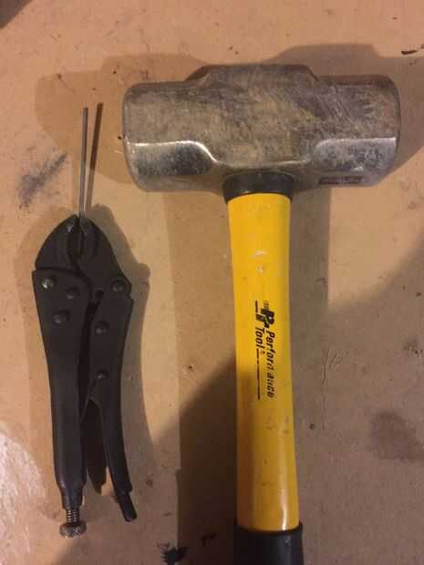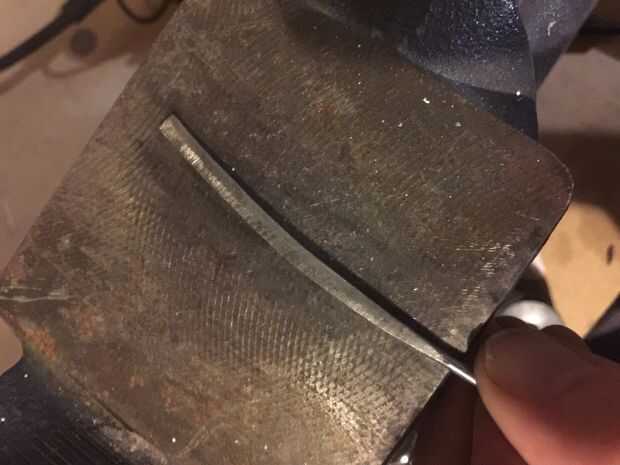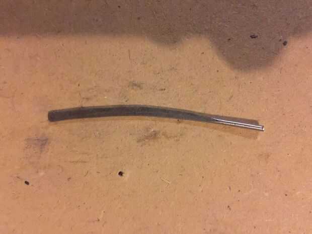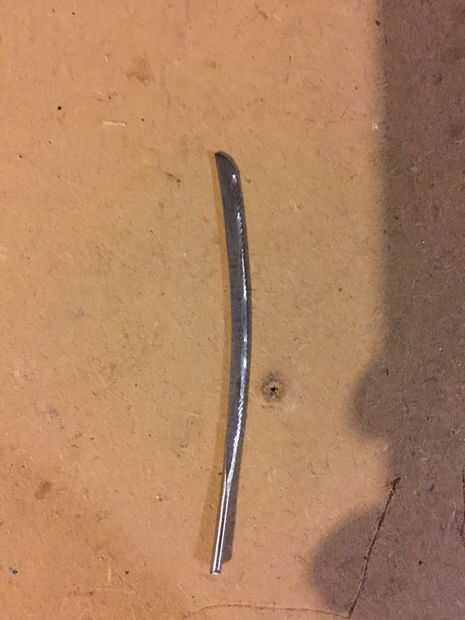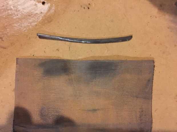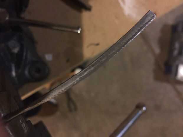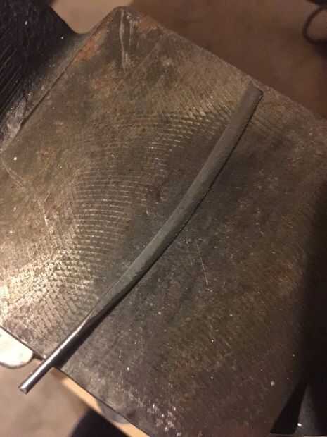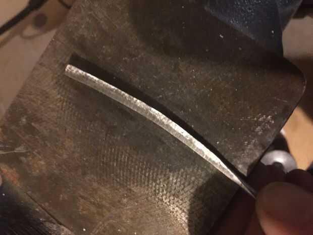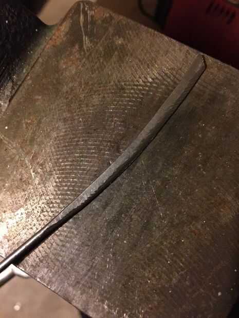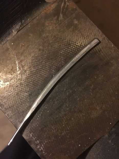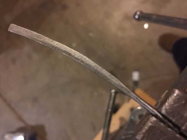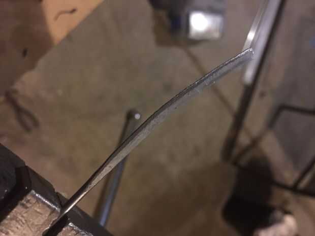En este momento cambia a un martillo de tamaño normal y comenzó a golpear intencionalmente a un borde de la parte aplanada de la suspensión. Este borde se convertirá en el filo de la Katana. Poco a poco el trabajo de donde estaría la guardia hasta el punto de la hoja. Usted comenzará a ver la hoja comienzan a rizarse. Una vez tuve un rizo decente en la hoja, he formado la punta con una esmeriladora de banco.