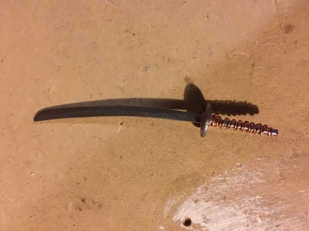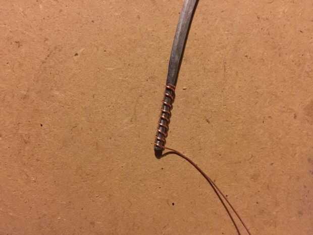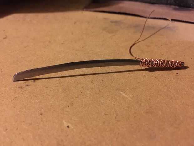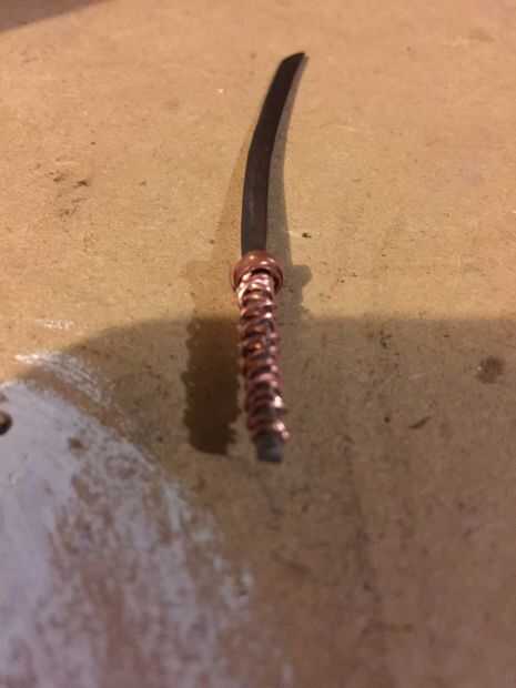 Envuelva un poco el resto aplanado del alambre de cobre alrededor del extremo de la Katana para formar el pomo.