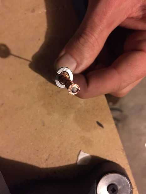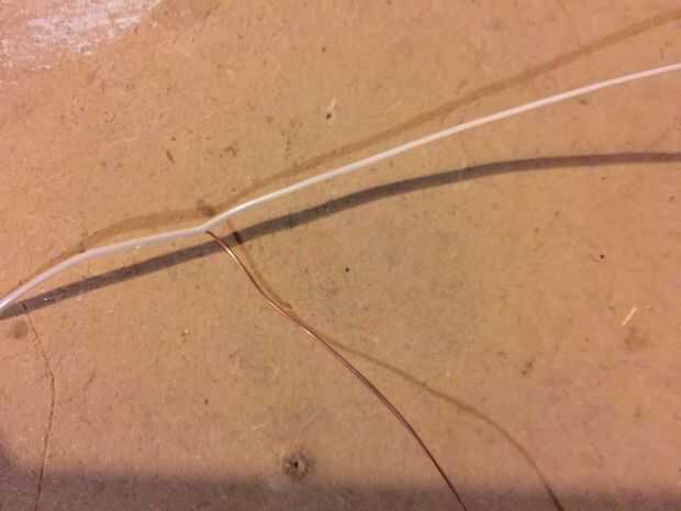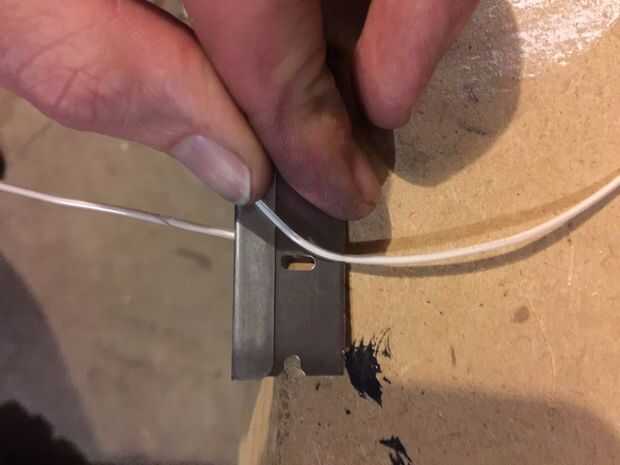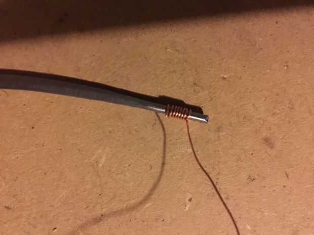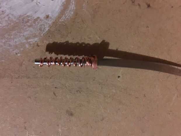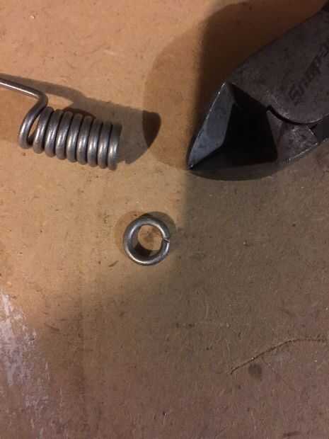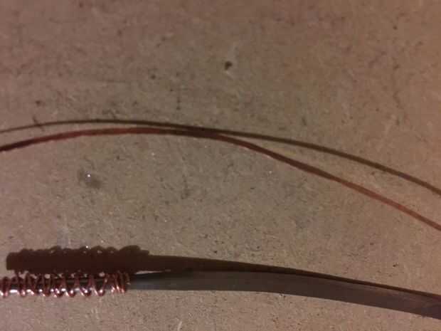 Corte otra duración de la suspensión y arena y lo prepare. Luego envuélvalo alrededor de una 1/4 broca, o cualquier tamaño socket funciona mejor. Utilizando el cortador de alambre cortado de un solo anillo, pellizque juntos y golpea varias veces con un martillo para adular un poco. Poner el protector alrededor de la pieza aplanado de alambre y debe mantenerse ligeramente en su lugar.
