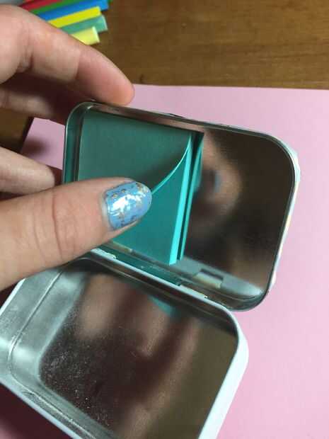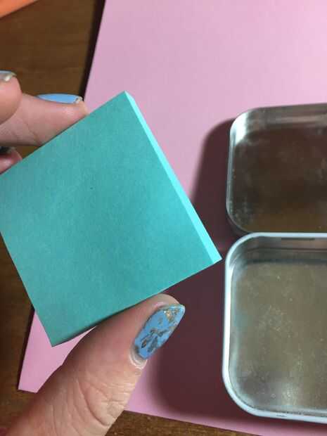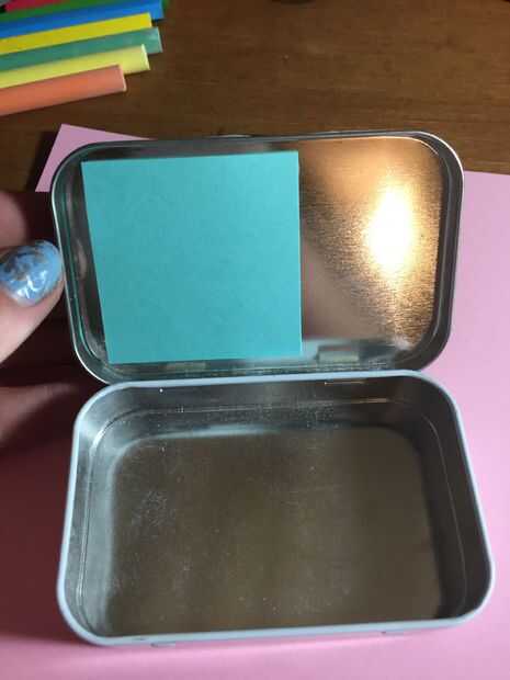 Esta parte es fácil. Tomar tus notas post-it mini y pegarlas en el interior de la lata con pegamento fuerte o cinta de doble cara. Dejar secar si es necesario. Echa un vistazo a la foto para la referencia.