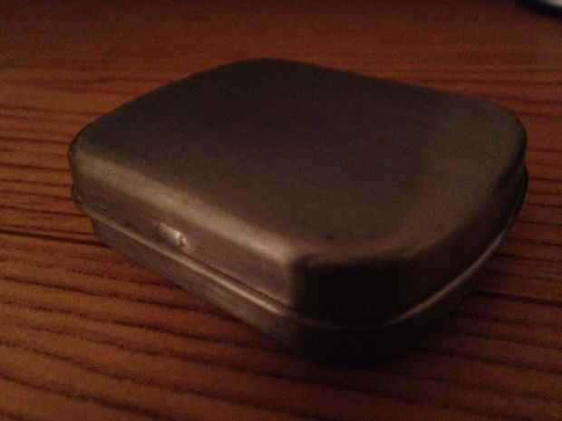 Lo que hice fue arena de la pintura. Se carga con algunos artículos que podrían ayudar en fuego haciendo, un elemento clave en la supervivencia. Es 2 1/2 de ancho, 2 de largo y 3/4 en alta. Podría caber fácilmente en un bolsillo de la moneda pequeña en un par de jeans.