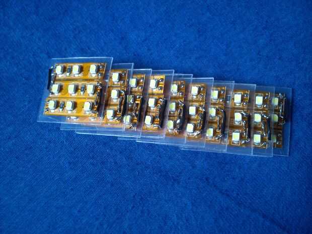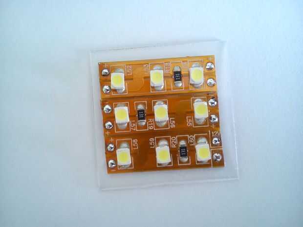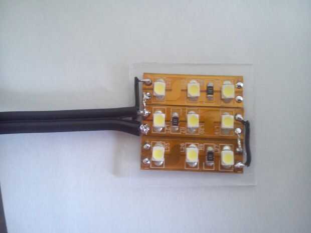 Ahora es el momento para conectar el LED. Cortada la tira de 3 LED. Quite la película protectora de la parte posterior de las piezas y pegue 3 de ellos en cada una de sus pequeñas piezas cuadradas para que el lado positivo de la pieza de tira en el medio está al lado del lado positivo de la pieza de al lado y el lado negativo al que lado negativo de él es vecino.