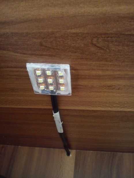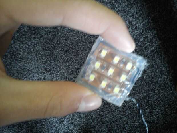 Cuando haya terminado de soldadura se aplica pegamento caliente a la frontera de la pieza inferior de plástico con luz LED y poner la segunda pieza de plástico en la parte superior. Use un cuchillo para quitar el exceso de pegamento. Aplique un trozo de cinta de doble cara en la parte posterior del panel y tal vez también a su Panel led y el cable terminado.
