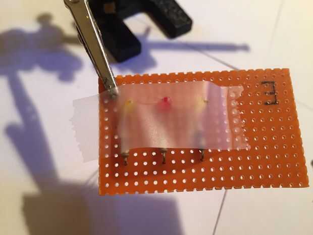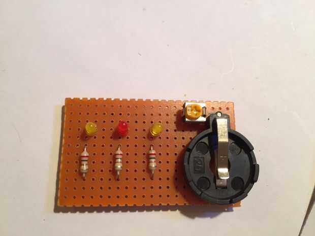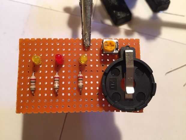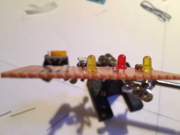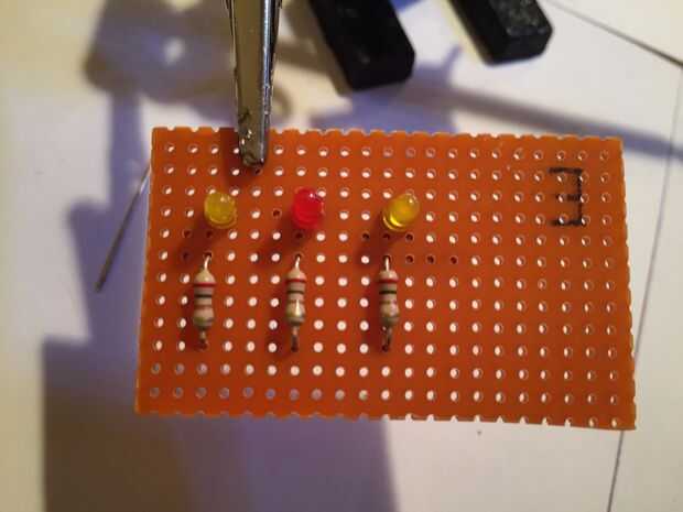 1 - colocar los 3 LEDs como lo muestra en la foto. El lado positivo (la pata más larga) a la izquierda. Comprobar las fotos para más detalles.