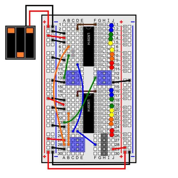 - Enchufe los extremos macho de los cables de jumper en la placa. He incluido el diagrama protoboard para referencia. Los hilos de cada cátodo ir en filas 1-10 para el primer LM3914 y filas 16-25 para el segundo LM3914. Los cables del ánodo común ir al bus de energía positiva.