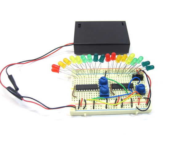 Antes de empezar a construir las torres, recomiendo montar todo el circuito (incluyendo LEDs) en un protoboard y probarlo. De esa manera no conseguirás una sorpresas desagradables cuando construyes todo y algo no funciona. El circuito de "prueba" utiliza un potenciómetro (que forma un divisor de tensión) como la entrada en lugar de una señal de audio analógica. Este paso es sólo instrucciones de montaje - si quiere aprender cómo funciona el circuito, vea el siguiente paso.