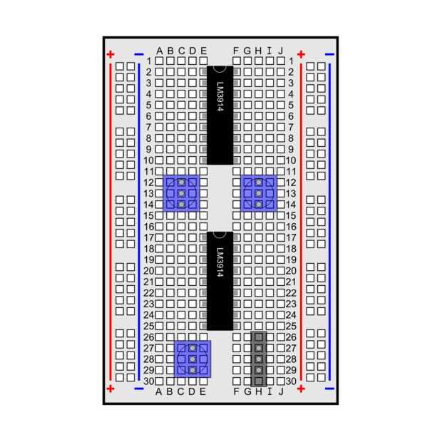 - Inserte un LM3914 para puentes el boquete en medio de la placa, de filas 2-10. Los pernos deben ir en las columnas E y f el. La marca de medio círculo pequeño en el paquete debe ir hacia arriba (hacia la fila 1).
