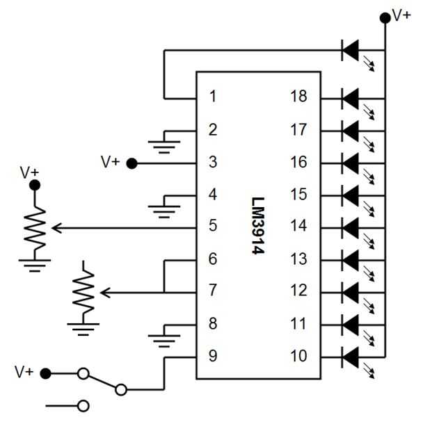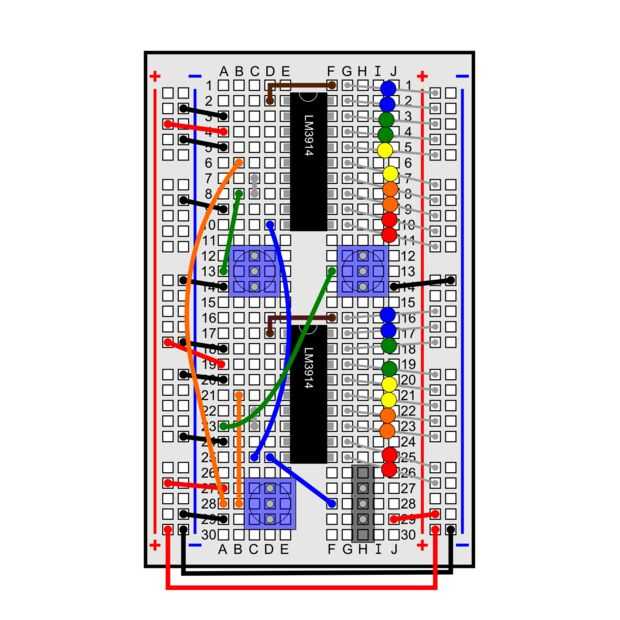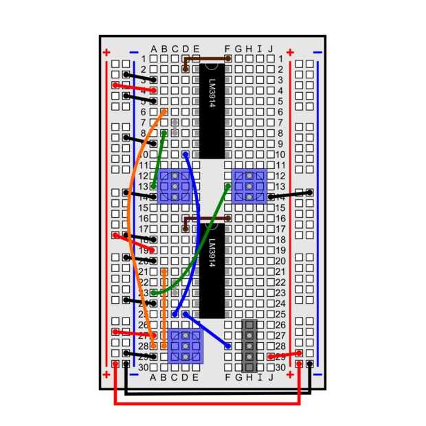 Si puede leer diagramas de circuitos (aquí es un buen tutorial para aprender y un artículo de Wikipedia con todos los símbolos comunes), la segunda imagen muestra el diagrama de un LM3914, así que usted puede duplicar que conectar ambos (tenga en cuenta que el potenciómetro de entrada analógico y el interruptor SPDT son compartidos entre los dos LM3914 en el protoboard Considerando que cada uno tiene su propio bote conectado a los pines 6 y 7).