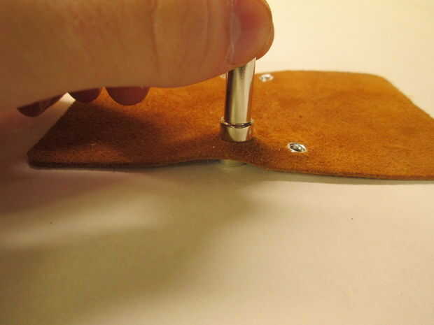 Bien, no son realmente son remaches, ojales y va a utilizarles para reforzar los agujeros que hicimos anteriormente. Apreté los ojales en su lugar, y que estaban en el agujero lo más lejos posible.