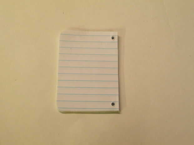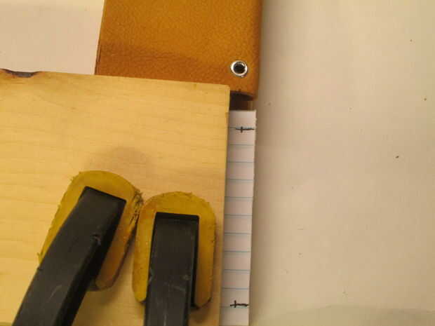El papel es cortado y el tamaño correcto, pero no se puede utilizar el Bloc de notas sin alguna forma de conectarlo. Si lo desea, puede utilizar a algún tipo de pegamento, pero utilicé el método más decorativo (y fácil) de perforación de agujeros y utilizando el cordón de cuero.