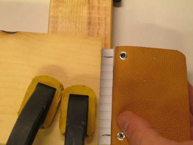 Para perforar los agujeros, tuve que guardar el documento como cerca de una sola pieza como sea posible. Lo hice por sujeción el papel entre dos pedazos de madera de desecho después de asegurarse de que los pedazos de papel eran como ras uno con el otro como sea posible. He marcado donde necesita taladrarse mediante la pieza de cuero como una referencia, ya que es lo que las piezas se pondría en. Luego eligió una broca agradable, fuerte y entró en lentamente. Encontró que era útil mantener al otro lado del papel hacia abajo con mi dedo, como ayudó a evitar que el papel de montar la broca y ser rasgado. Una vez que la broca fue todo el camino a través del papel (que me di cuenta porque empecé a conseguir aserrín), mantener la broca durante la perforación todavía. Por no moverla, pude limpiar el orificio. Entonces apagué el taladro antes de que me lo quitaron, para evitar rasgar el papel. Vea abajo para un ejemplo de Gif: