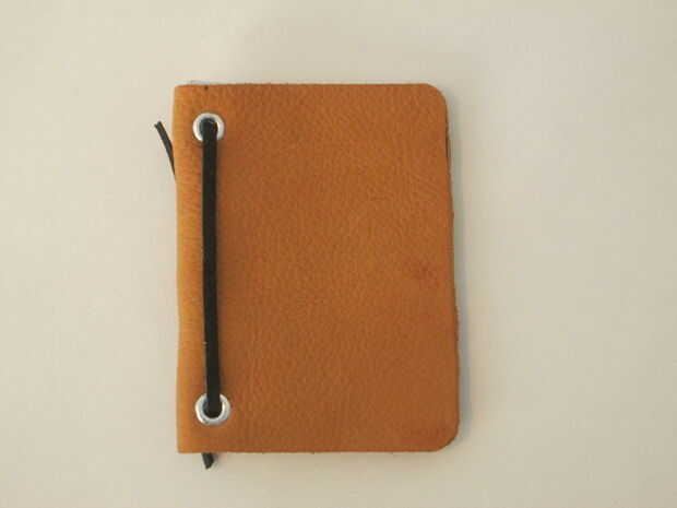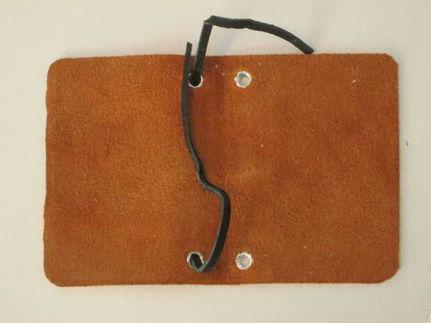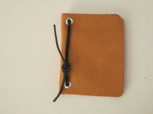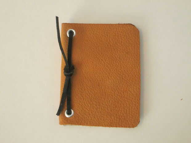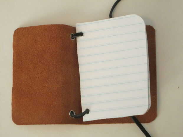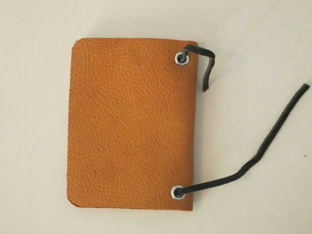 Esta parte es bastante simple. Cortar un trozo de cordón de cuero y ponerlo a través de los ojales delanteros, luego a través de los agujeros correspondientes en el libro y volver a través de los ojales traseros. Luego até los dos extremos con un nudo de arrecife (también conocido como el nudo cuadrado). Aviso que el cordón de la derecha sobre la izquierda en el primer nudo, pero el segundo nudo tiene el cordón izquierdo sobre el cordón derecho. Esto crea un nudo más visualmente atractivo y no al revés y también puede poner plana contra el Bloc de notas para estar más cómodo en el bolsillo.