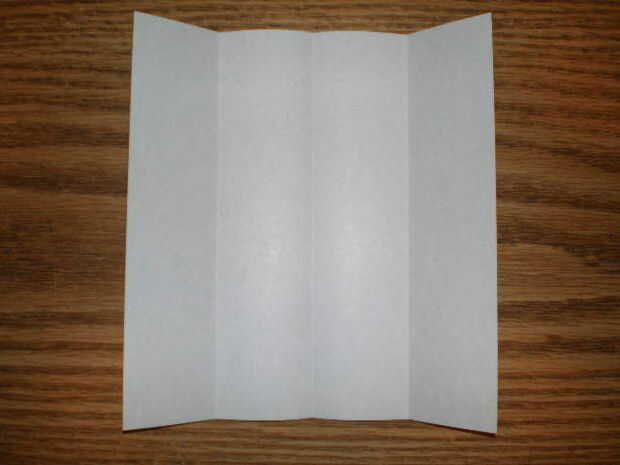 b. Coloque el lado blanco del papel hacia arriba. Se trata de color de las páginas en el libro. Hacer dobleces de Valle 3 (así que tiene un valle si se ve desde el lado) para dividir el papel en 4.